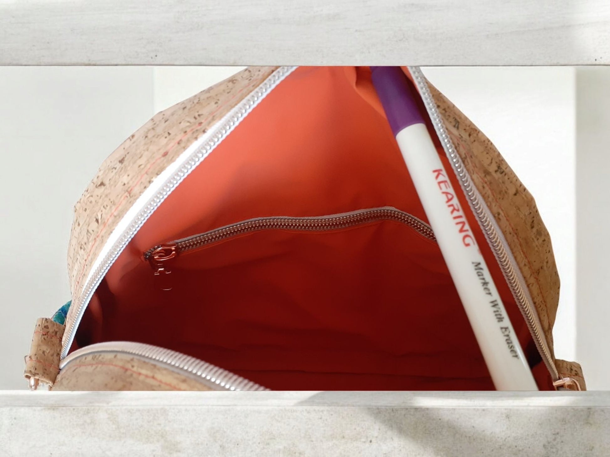 Materials: Combination of cork and canvas for the exterior; Waterproof canvas for the lining