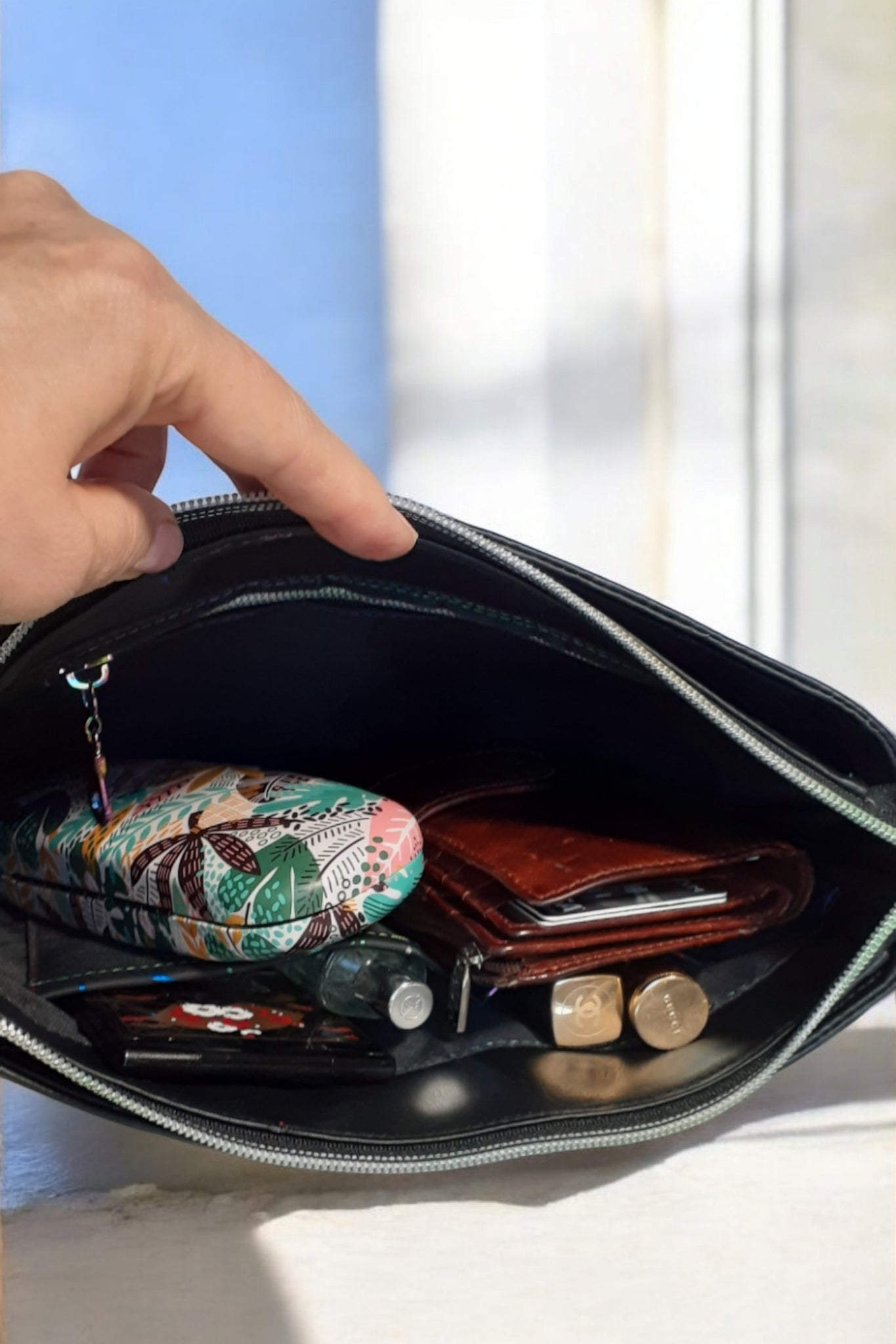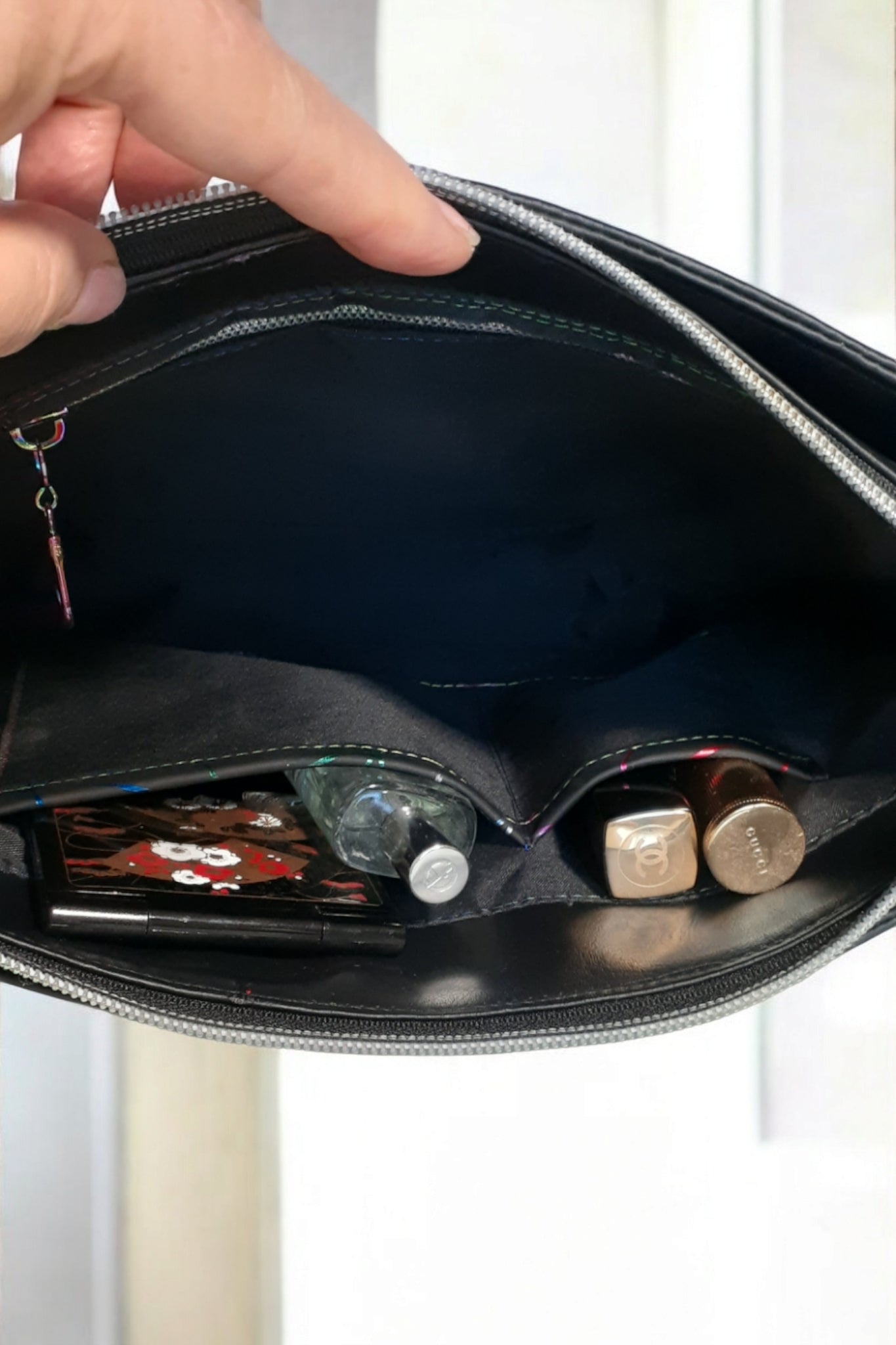 Materials: Combination of vinyl and faux leather for the exterior and strap; Waterproof canvas for the lining