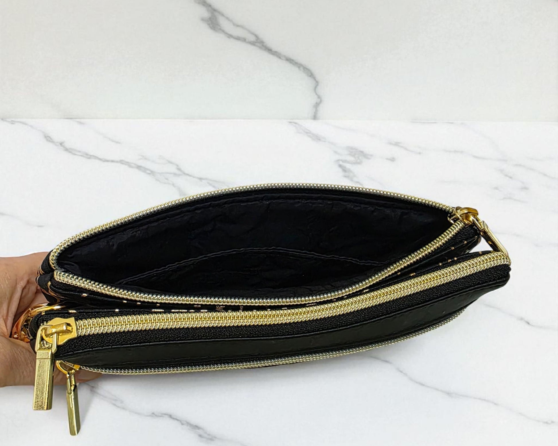 Three zipper pockets and one with magnetic snap closure. Detachable wrist strap. High quality gold zippers and hardware.