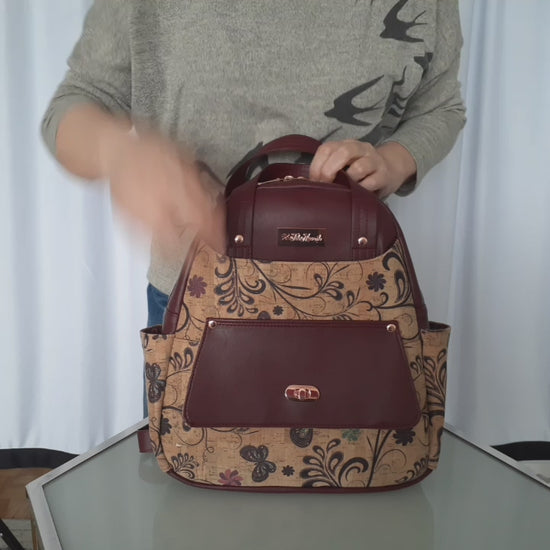 The stylish medium sized backpack, combines the comfort of a backpack with yhe elegance of a handbag. The bagckpack is in an even balance of weght across the shoulders and need for the extra space. This backpack is lightweght, designed with large slip pocket and pocket with flap and turn lock at the front; two side pockets; interior slip pocket and zipper pocket, and large main compartment. The straps are adjustable and handles are easy to grab when in rash.